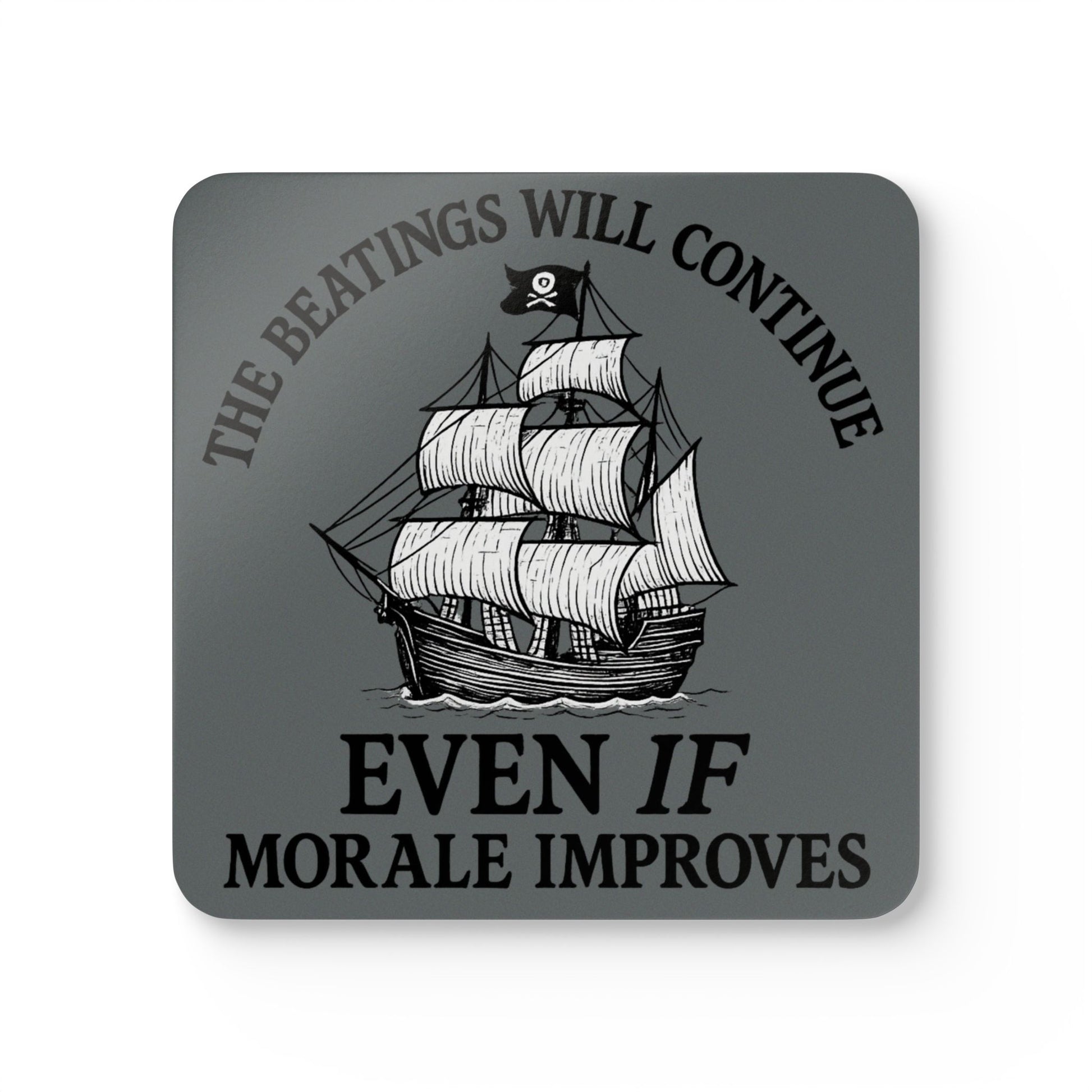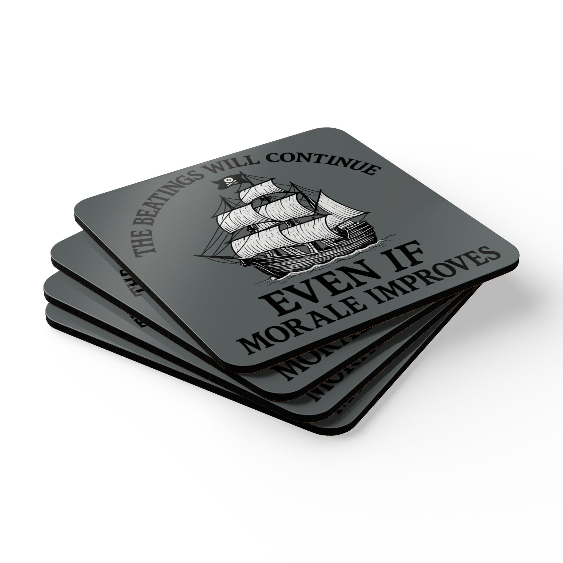 Pirate-Themed Cork Coaster Set - "The Beatings Will Continue"- Dark Grey
