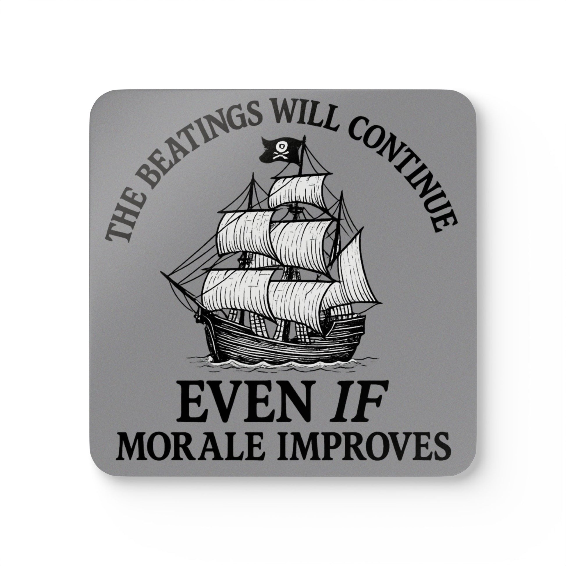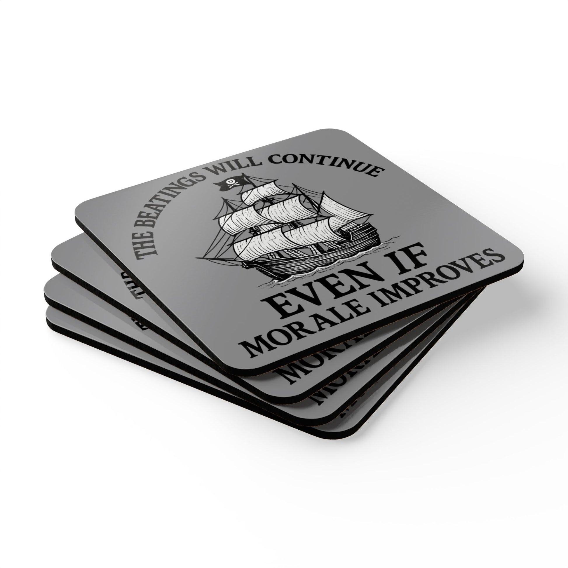 Pirate-Themed Cork Coaster Set - "The Beatings Will Continue"- Grey