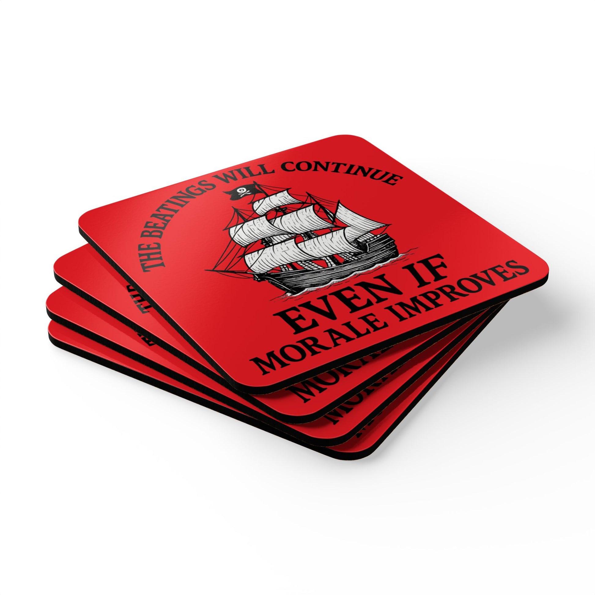 Pirate-Themed Cork Coaster Set - "The Beatings Will Continue"- Red